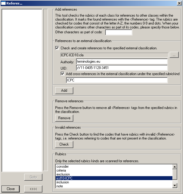 The Referer tool checks the text of the rubrics in the classification for references to other codes in the same classification. When it finds a reference it adds the ClaML <Reference> tags around the code. These references are shown as hyperlinks in the rubrics window of ClaM.