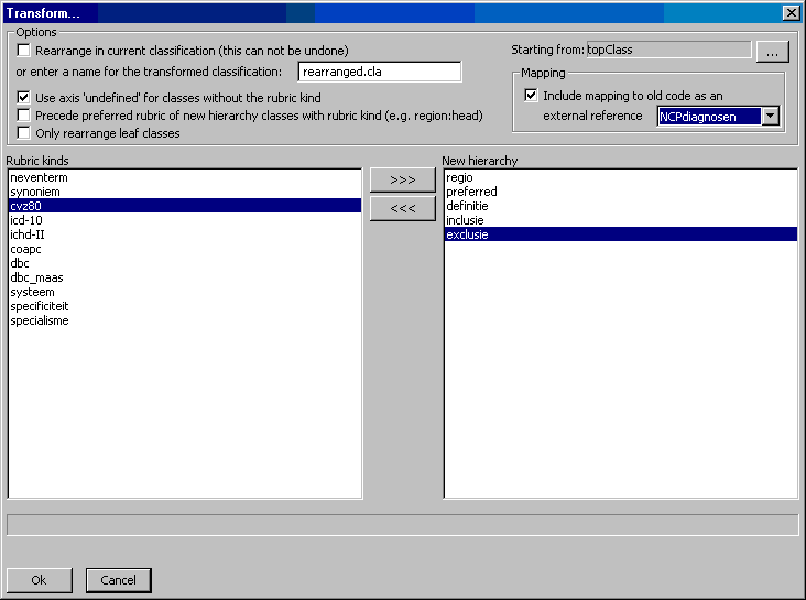 For certain purposes it may be necessary to rearrange a classification into a (possibly multihierarchical) format. For example the user may have choosen to group diseases by the body region where they may occur. If that kind of information is not yet available, one can either add it to ClaM in editing mode, or one might produce a two column text based table, where the first column contains the code of the class, and the second column contains the body region. If more regions are applicable for a class, create one line per body region. We advise to produce the tabular list, because it can be reused if the mother classification is updated. Import these data following general import instructions